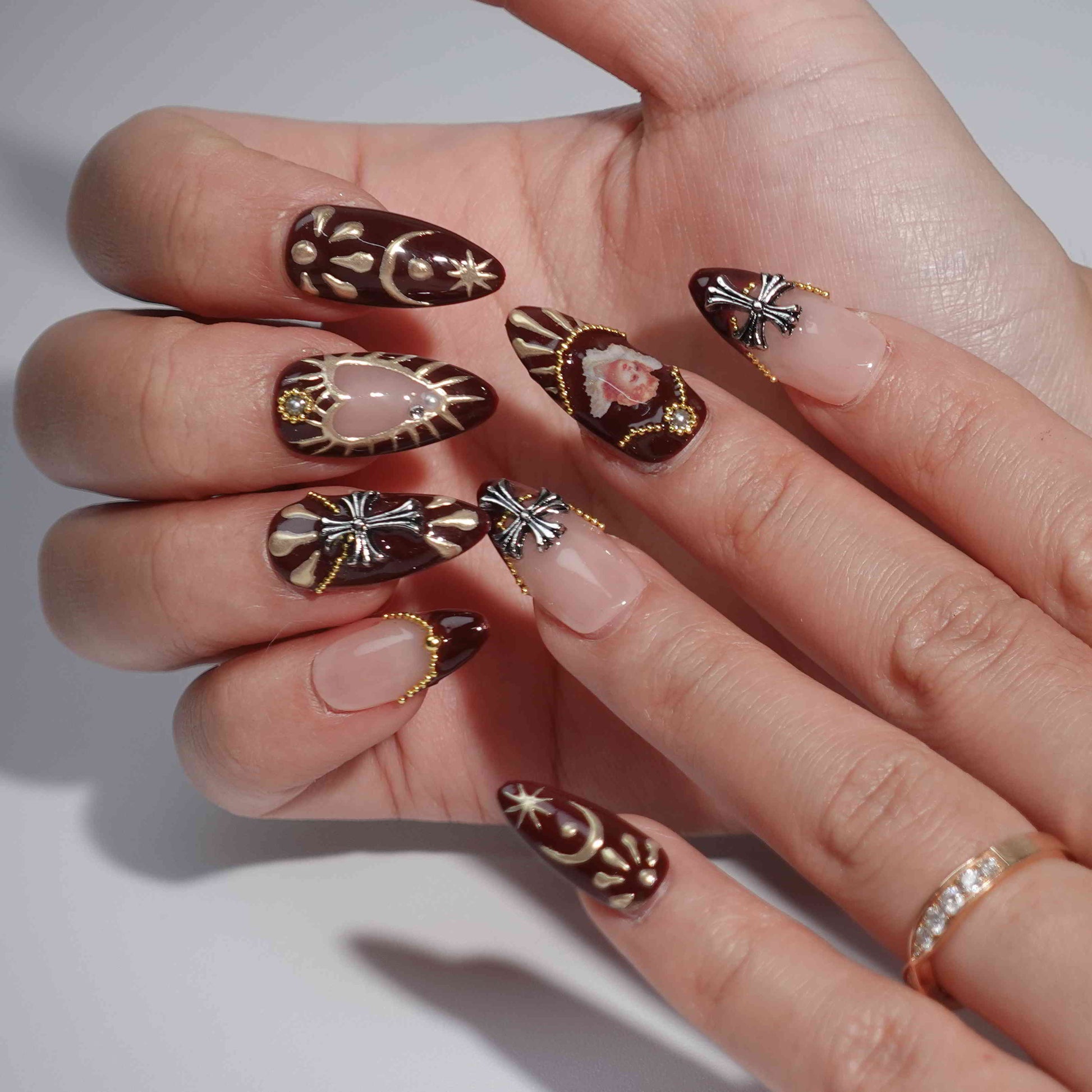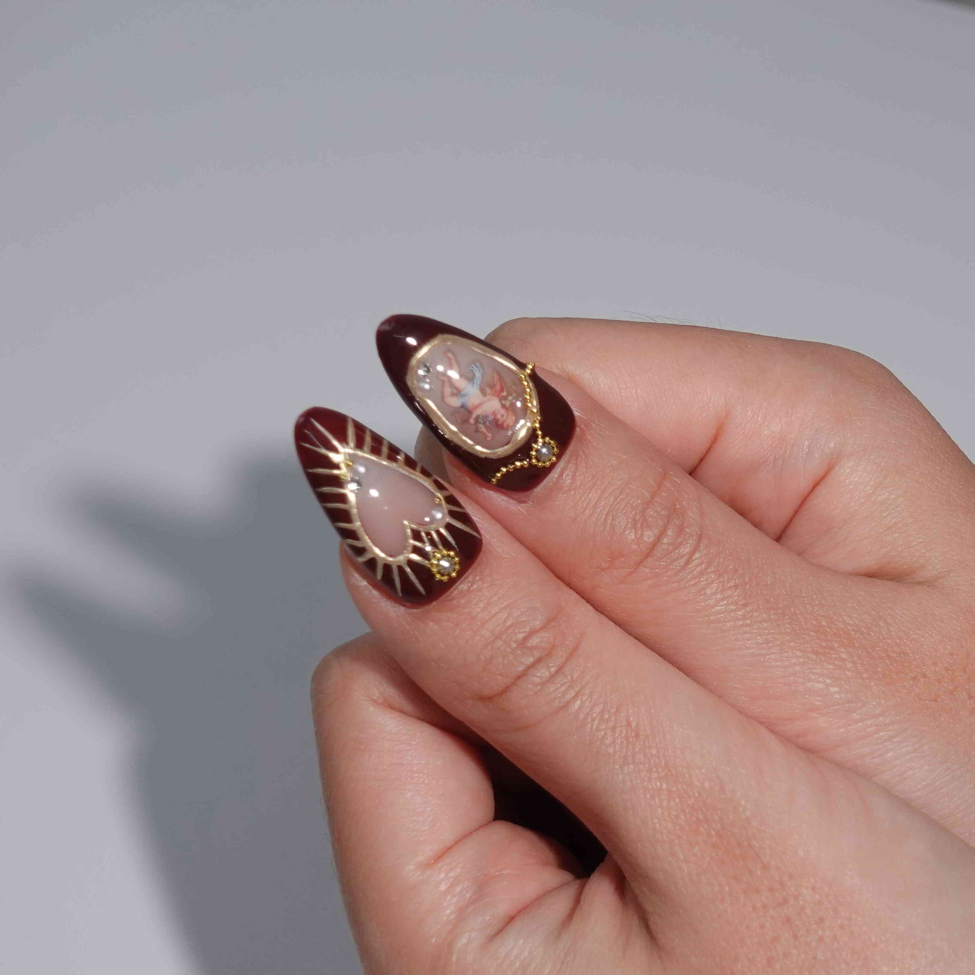 Baroque Seraph offers a captivating look. These Medium Almond press-on nails feature a Chrome and Painted style, exuding an elegant and refined mood. Our diverse, handmade brand infuses creativity into every nail set. Each is 100% handmade for salon-quality results.