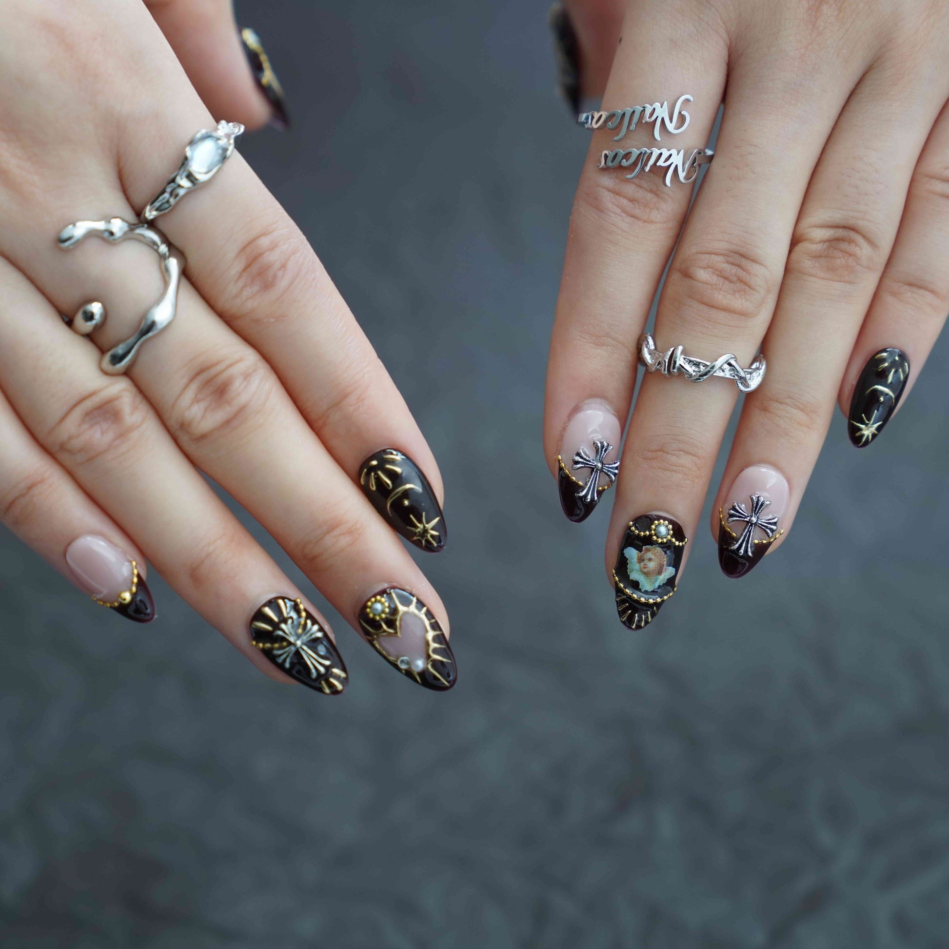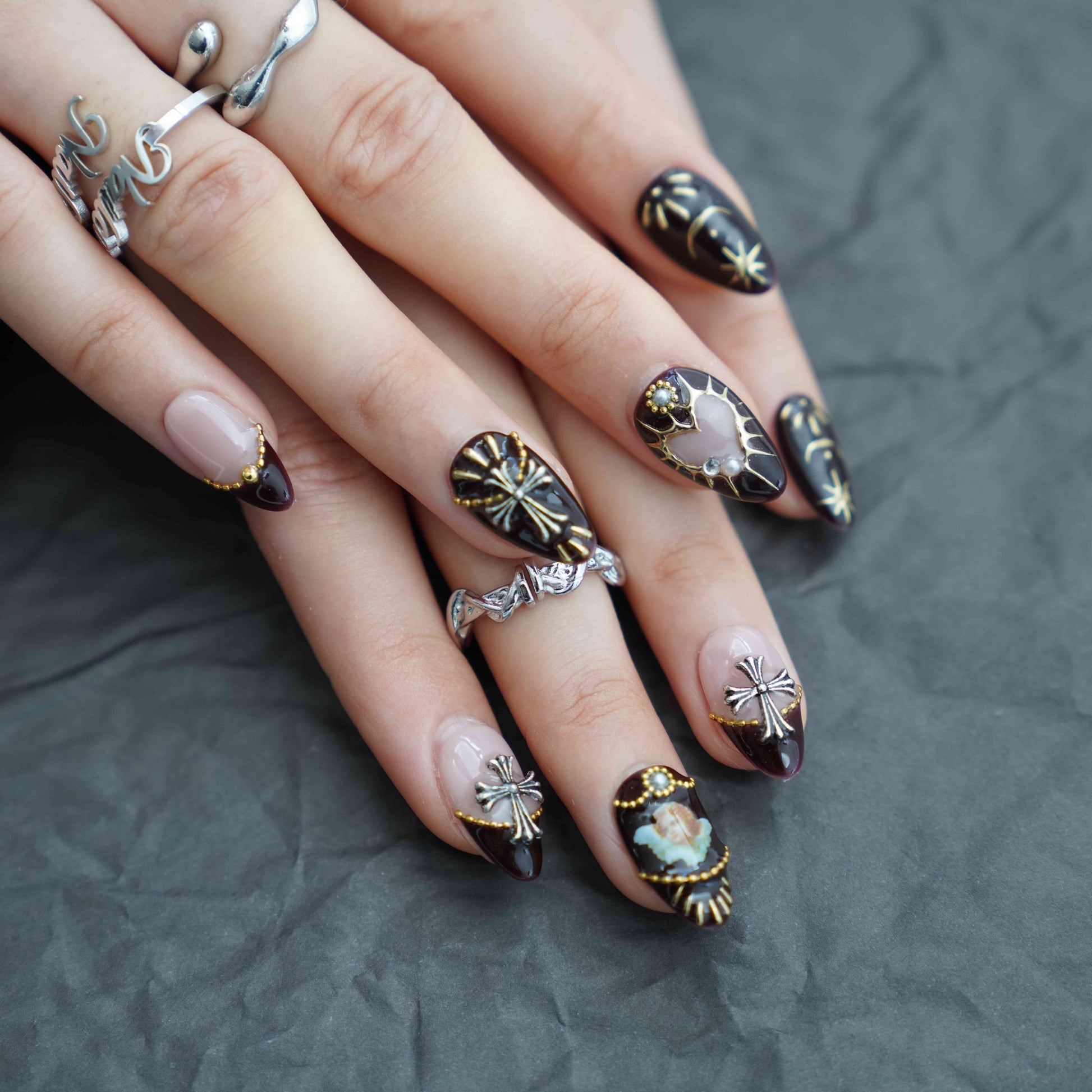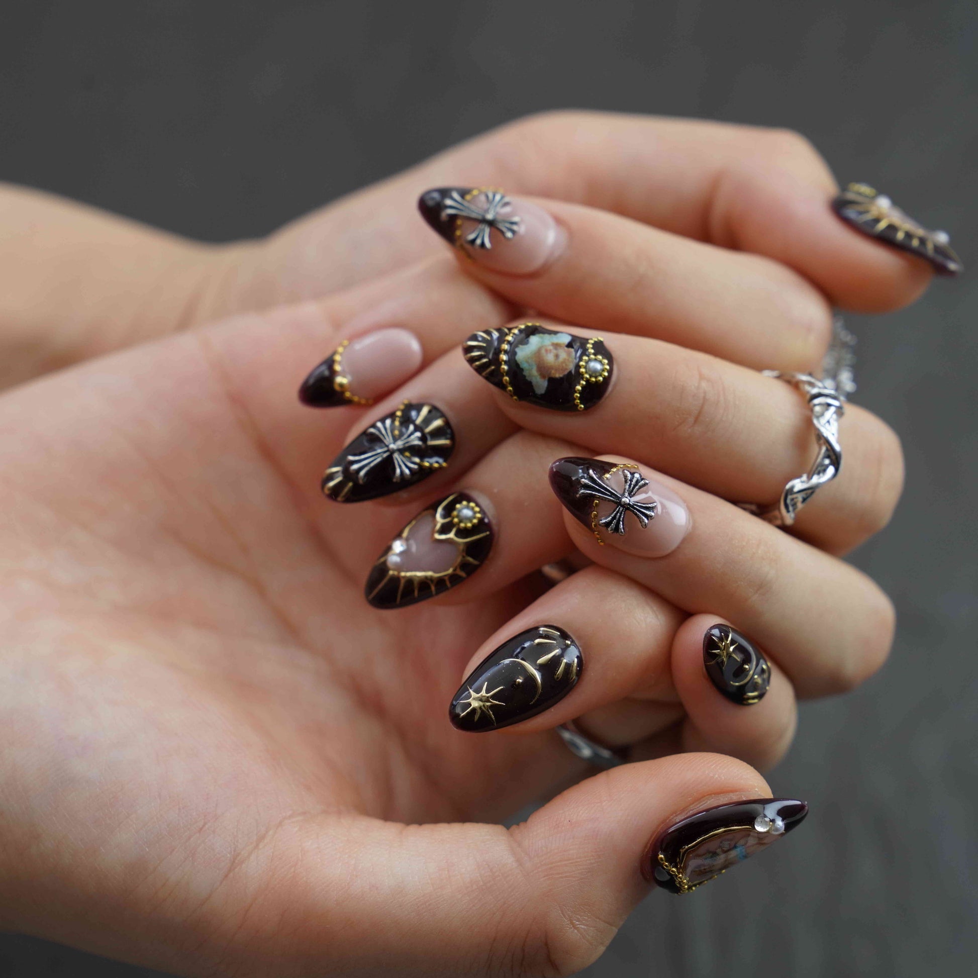 Baroque Seraph - Short Almond features a Chrome and Painted style on Short Almond press-on nails, creating an elegant and sophisticated look. Our diverse, handmade brand infuses creativity into each design. These 100% handmade nails offer salon-quality appeal.
