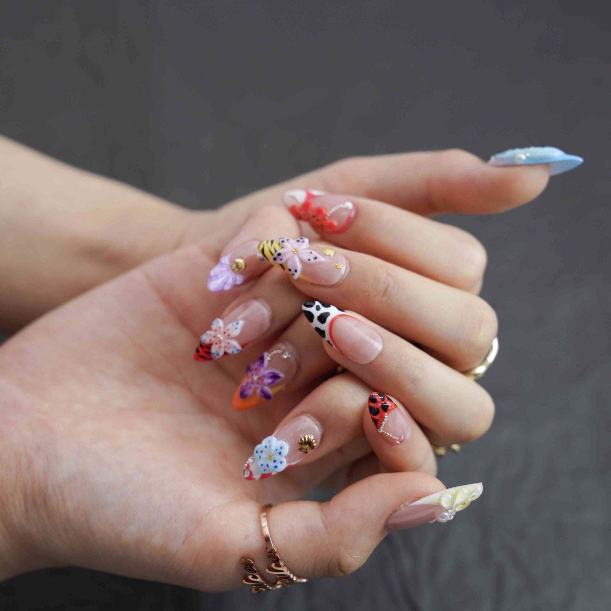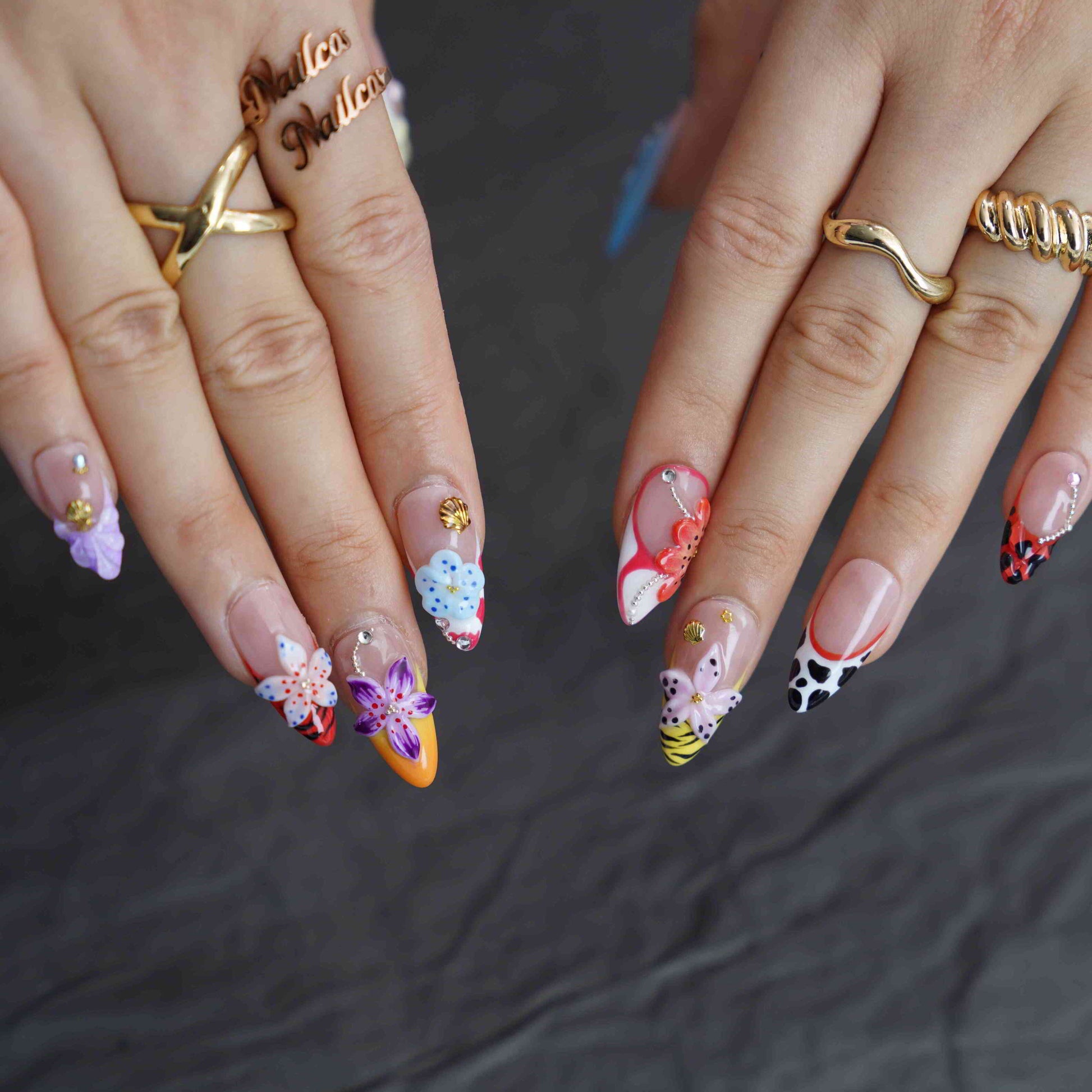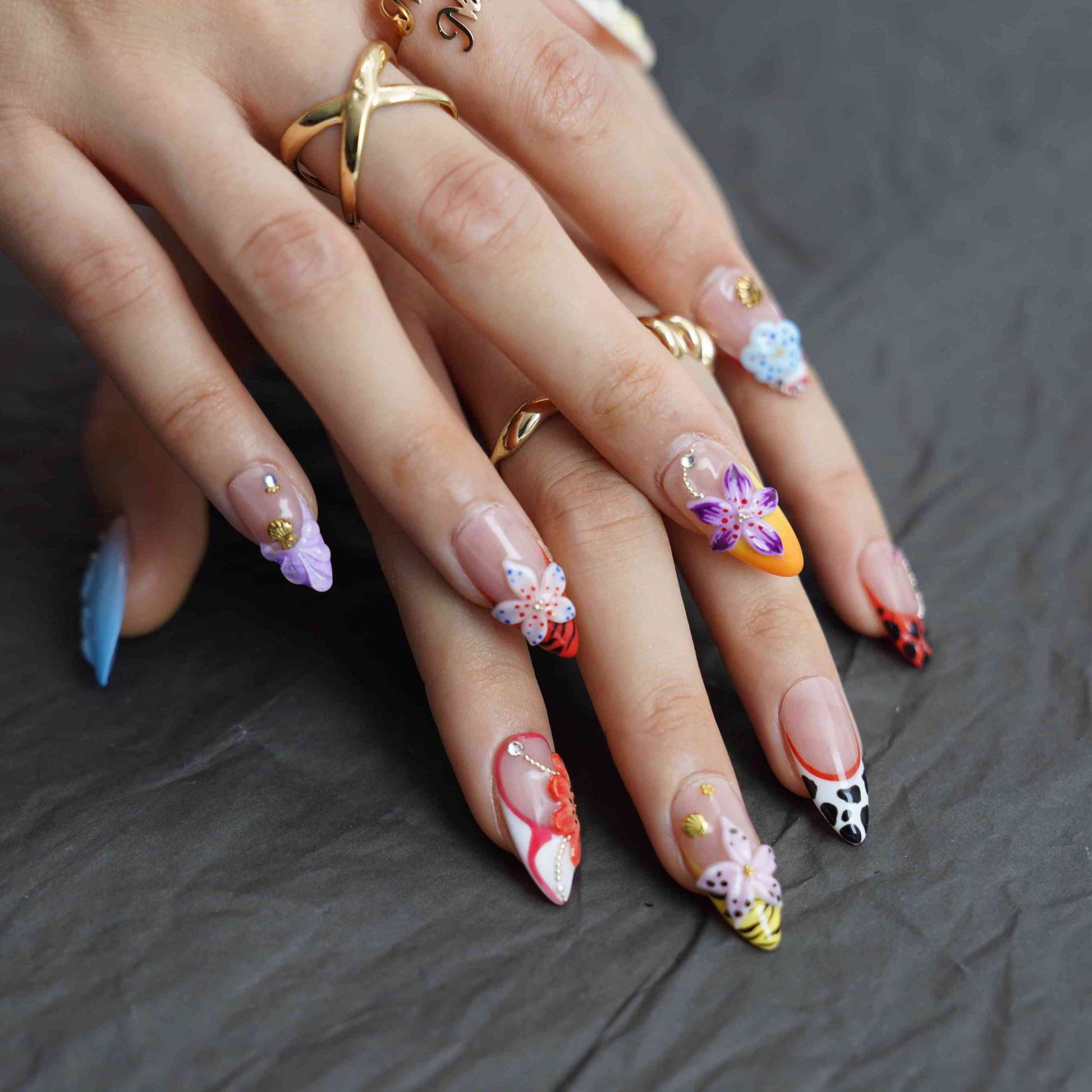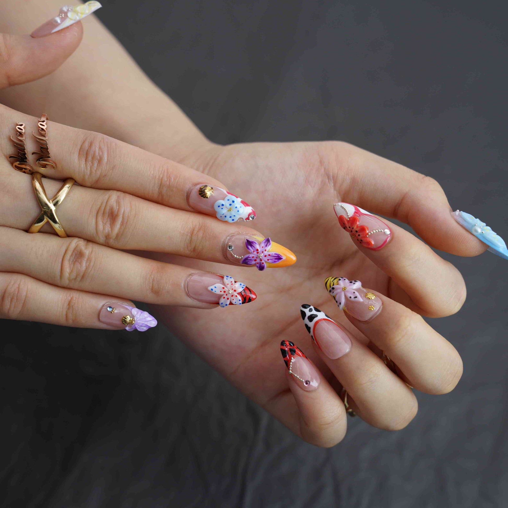 Blossom Symphony offers a captivating look. These medium almond press-on nails feature a 3D floral style, evoking a delicate and charming mood. Our diverse, handmade brand infuses creativity into each piece. They're 100% handmade for salon-quality elegance.