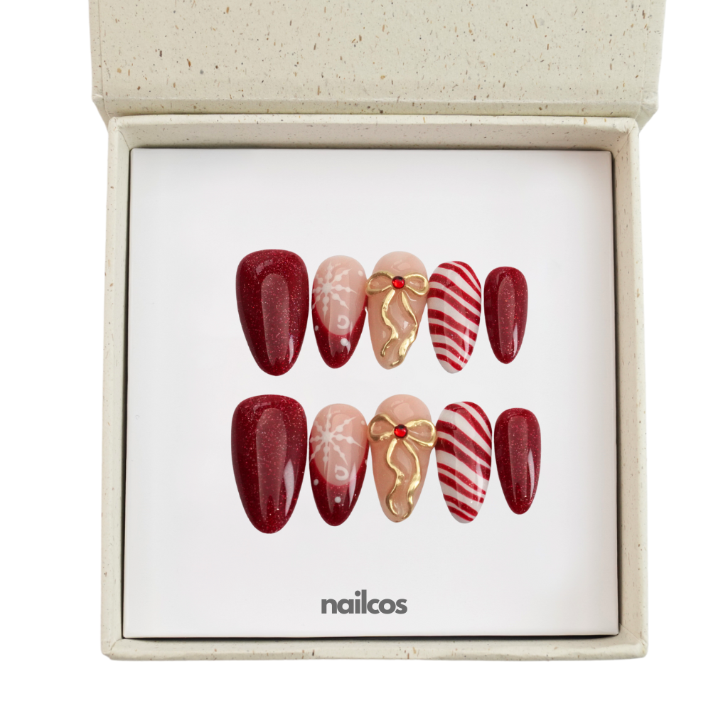Candy Noel is from our Christmas collection. Embrace the season with these Medium Almond press-on nails featuring painted Christmas / Winter motifs in festive hues. Our diverse, handmade brand blends creativity into every unique design. Each set is 100% handmade for elegant, salon-quality wear.