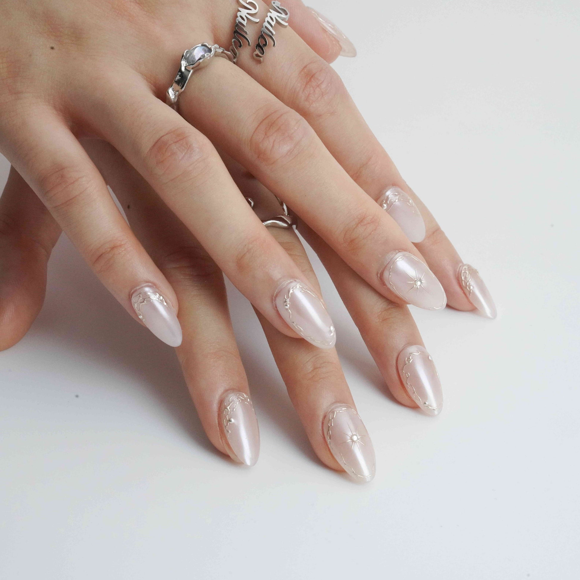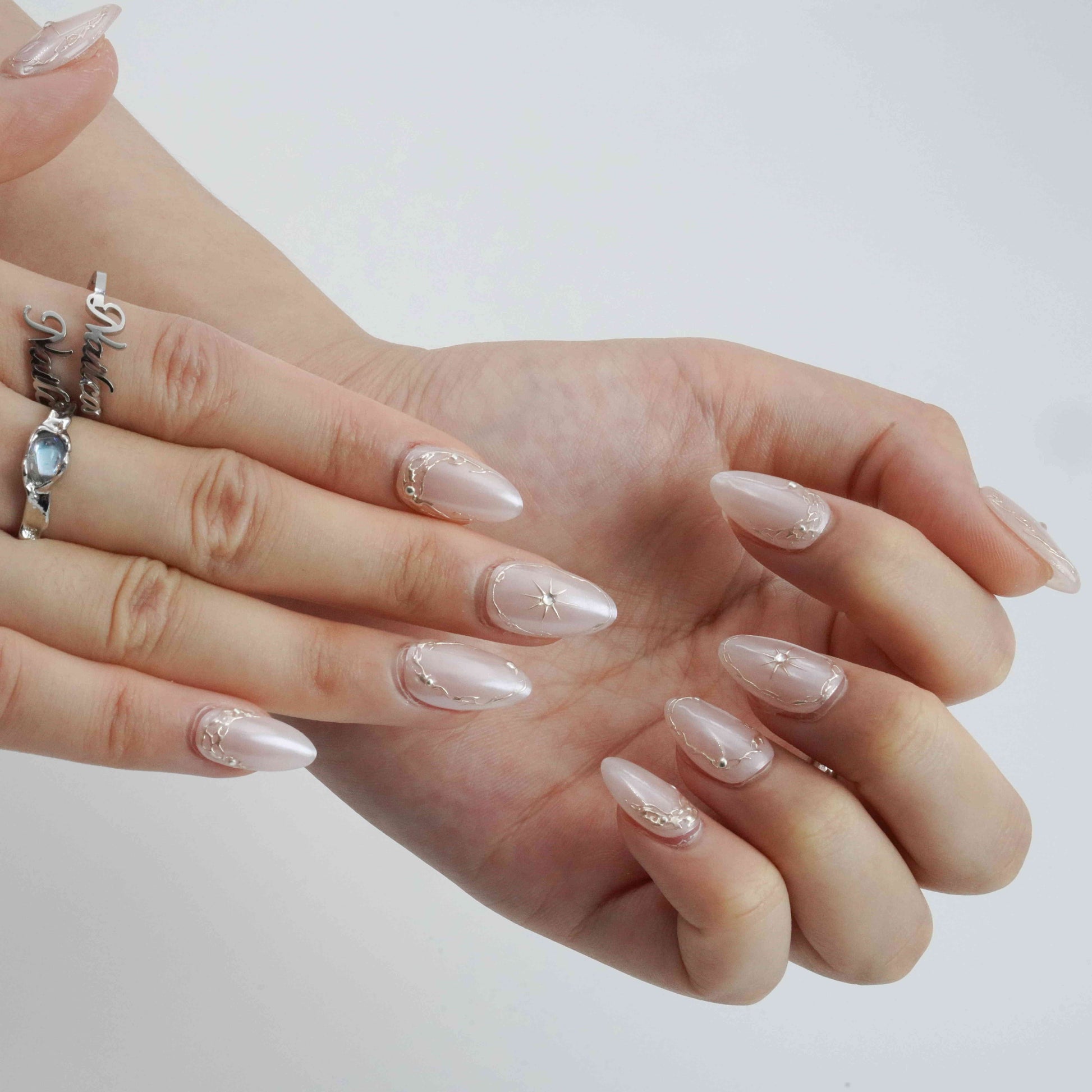 Celestia features a Short Almond shape with Chrome and Glazed styles, offering sophisticated press-on nails with a trendy and eye-catching aesthetic. Our diverse, handmade brand infuses creativity into each design. Every set is 100% handmade for salon-quality results.