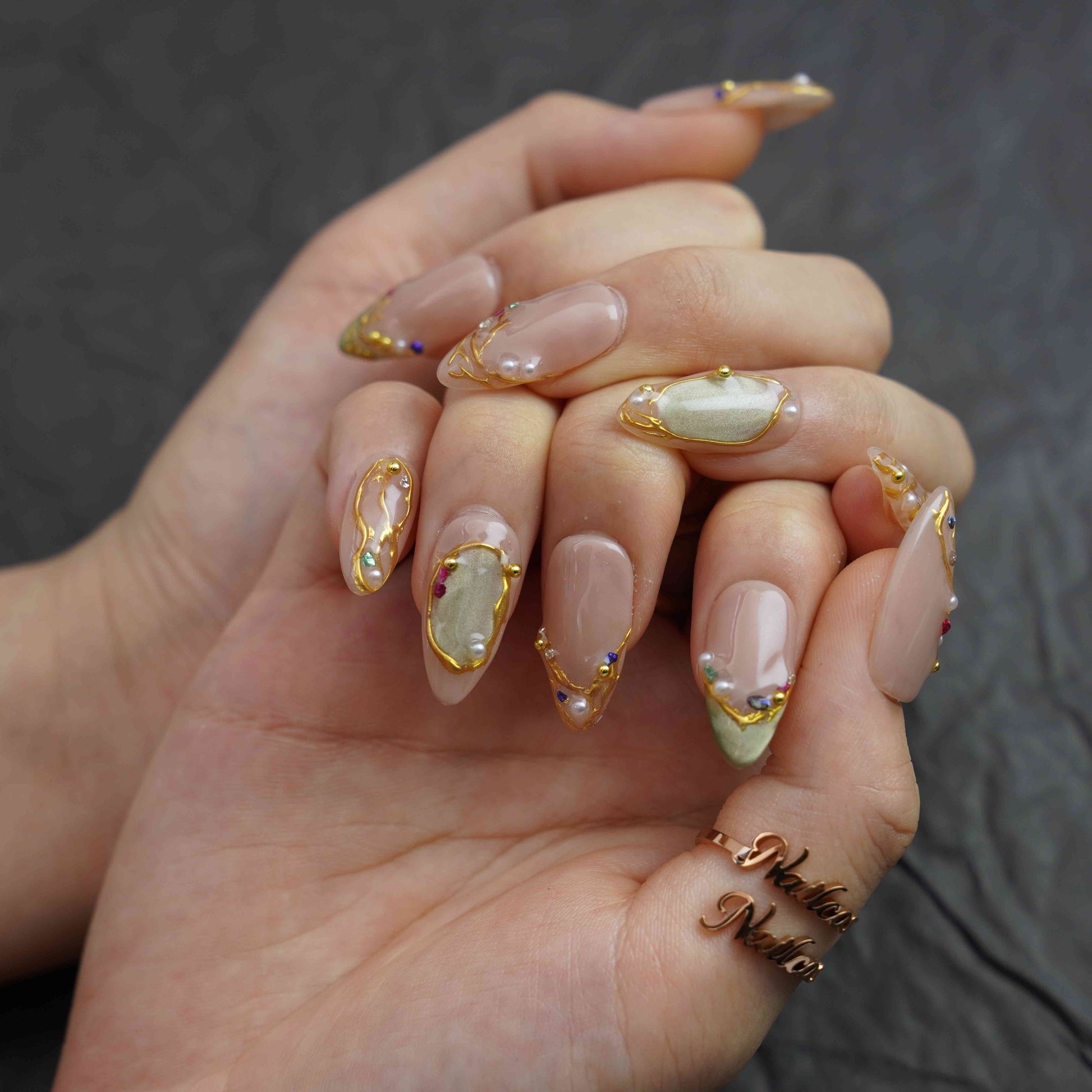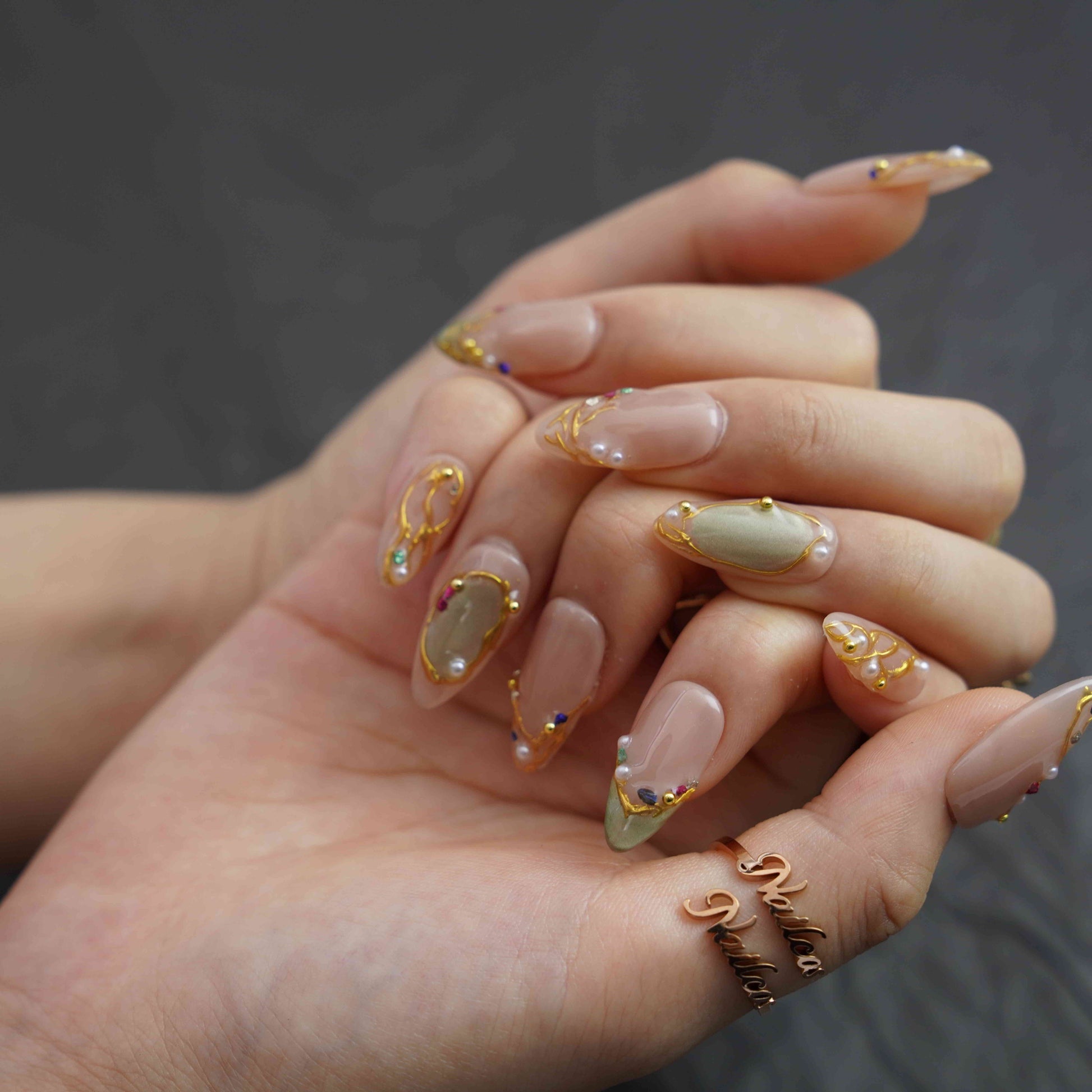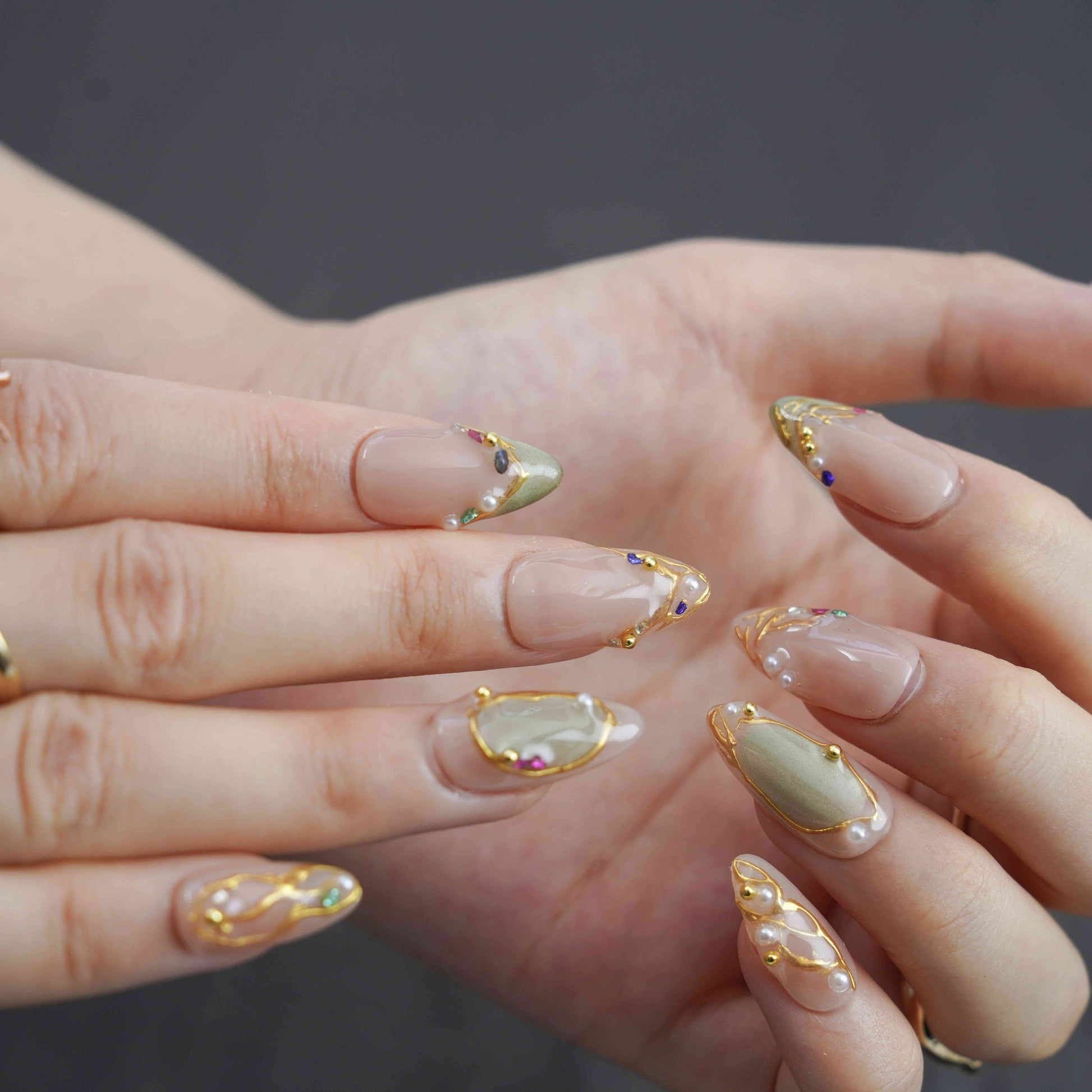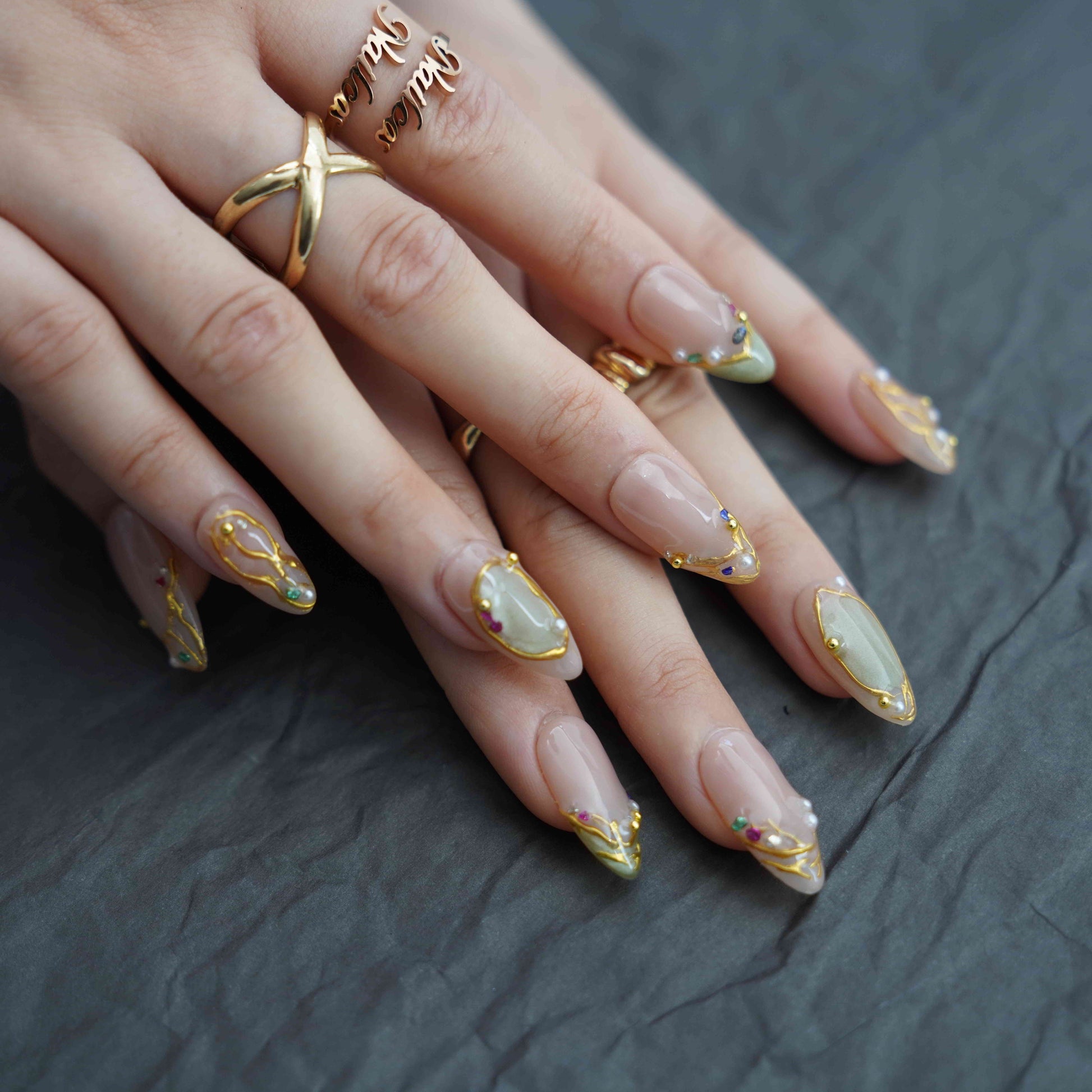 Gem Vine is from our Mix Lab collection. These press-on nails feature a Short Almond shape with a Cat Eye style, offering an alluring and sophisticated look. Our diverse, handmade brand infuses creativity into each design. They're 100% handmade for salon-quality elegance.