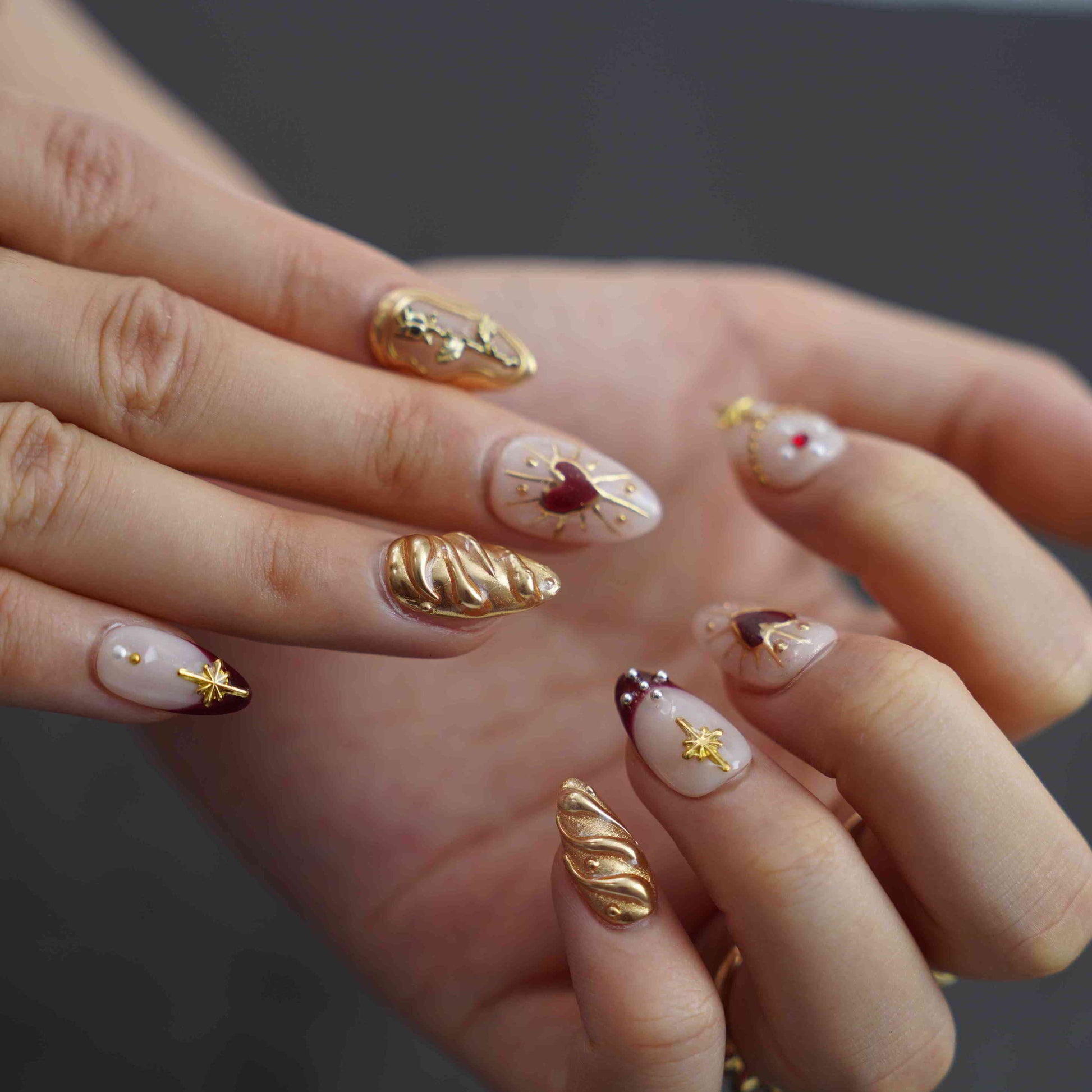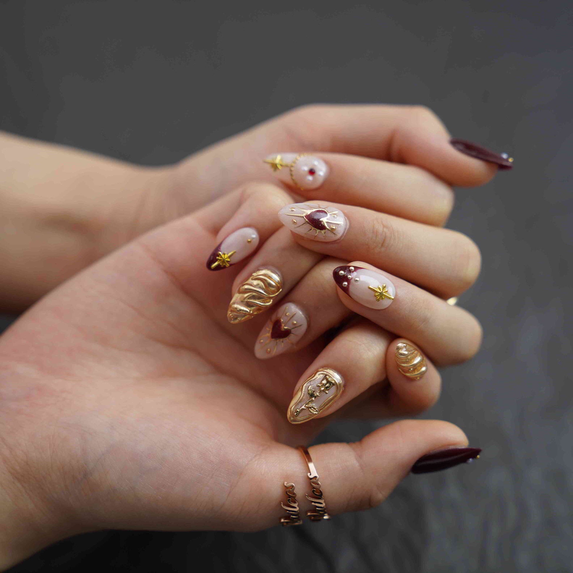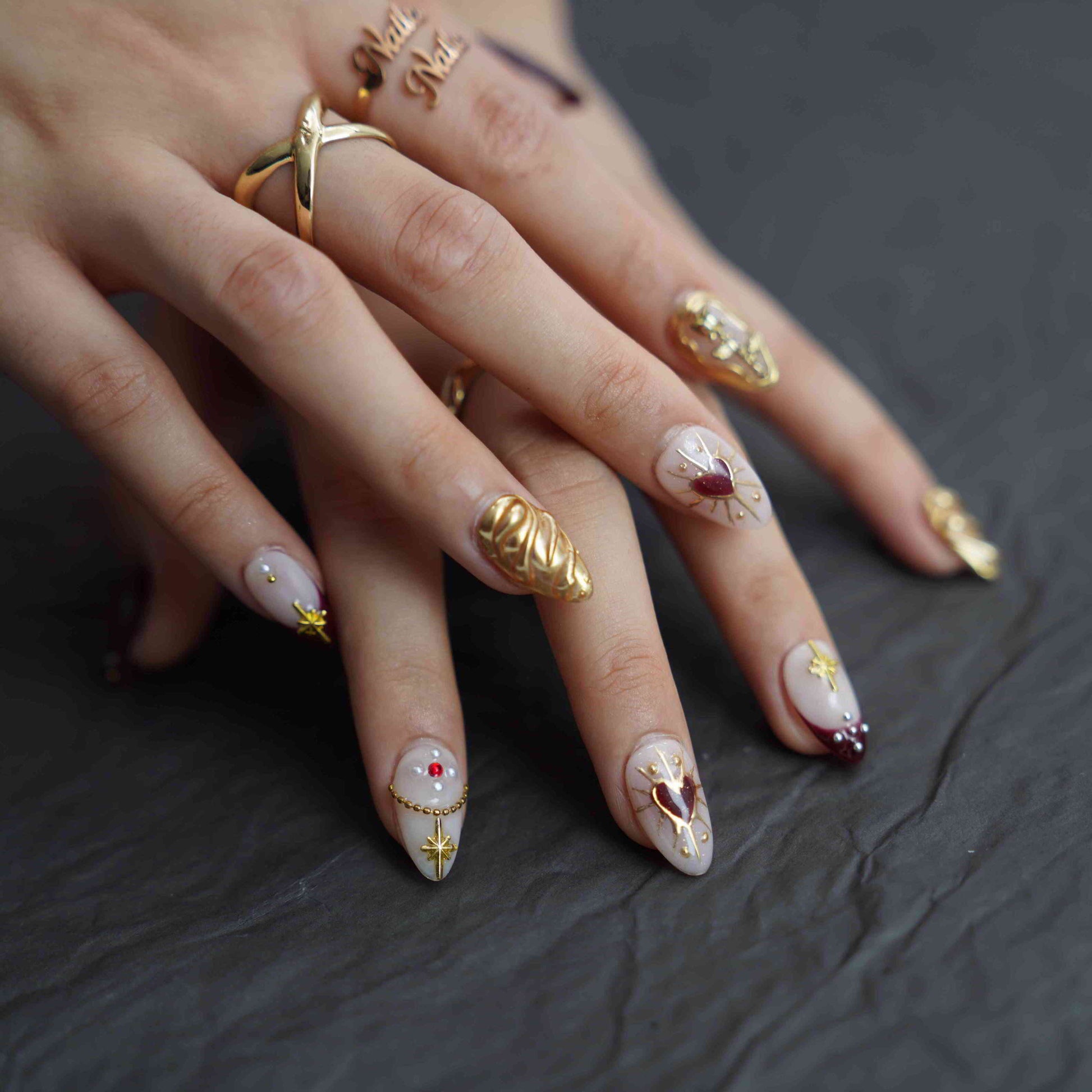 Golden Era features short almond press-on nails with a painted design, blending artistic flair and everyday elegance. Our diverse, handmade brand celebrates creativity in every unique set. Each piece is 100% handmade for salon-quality durability and style.