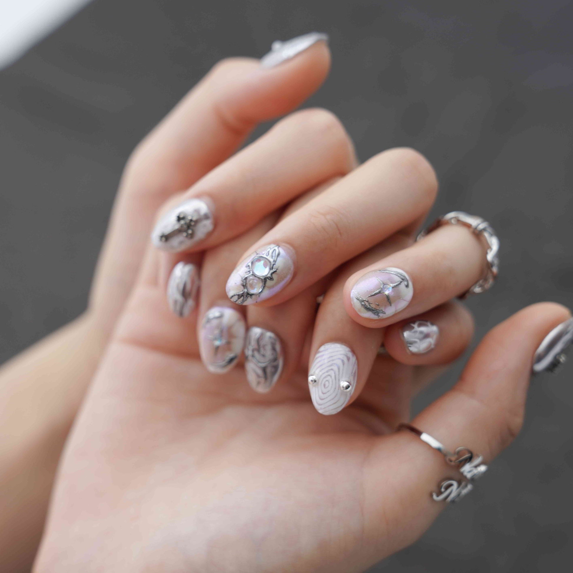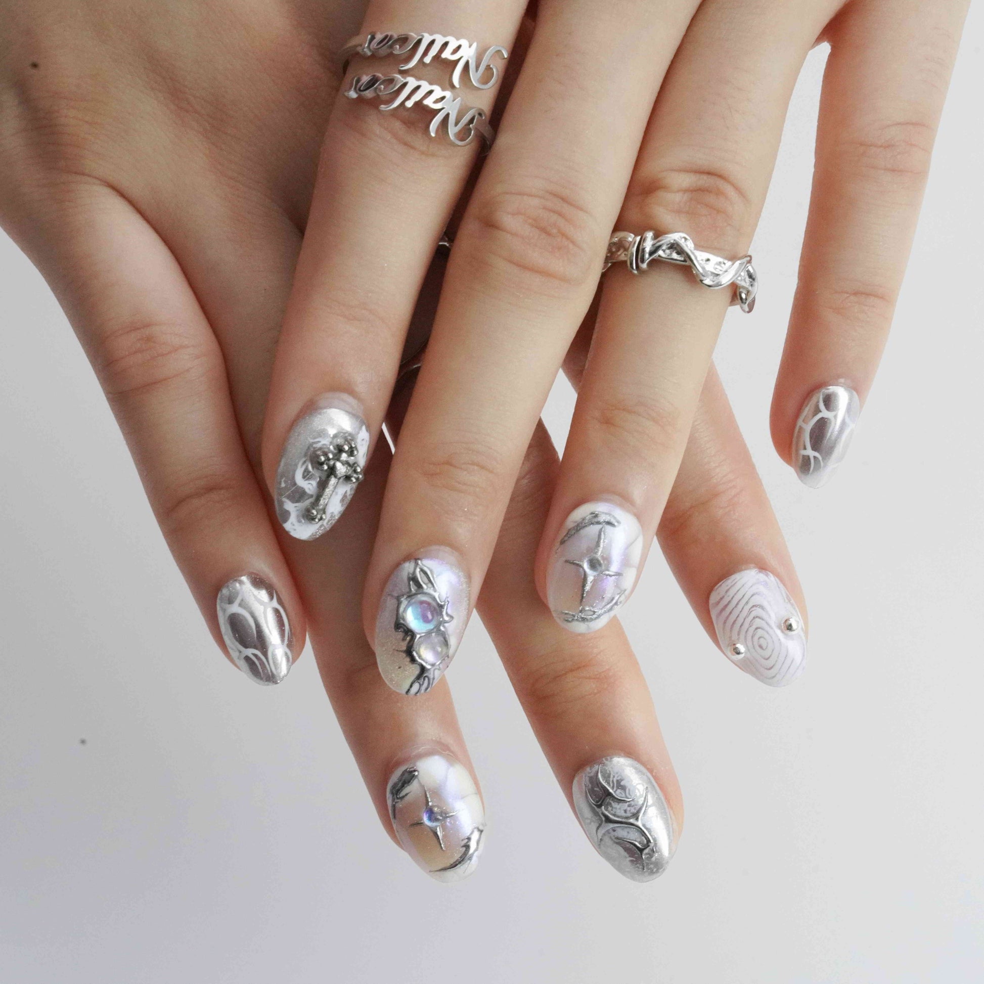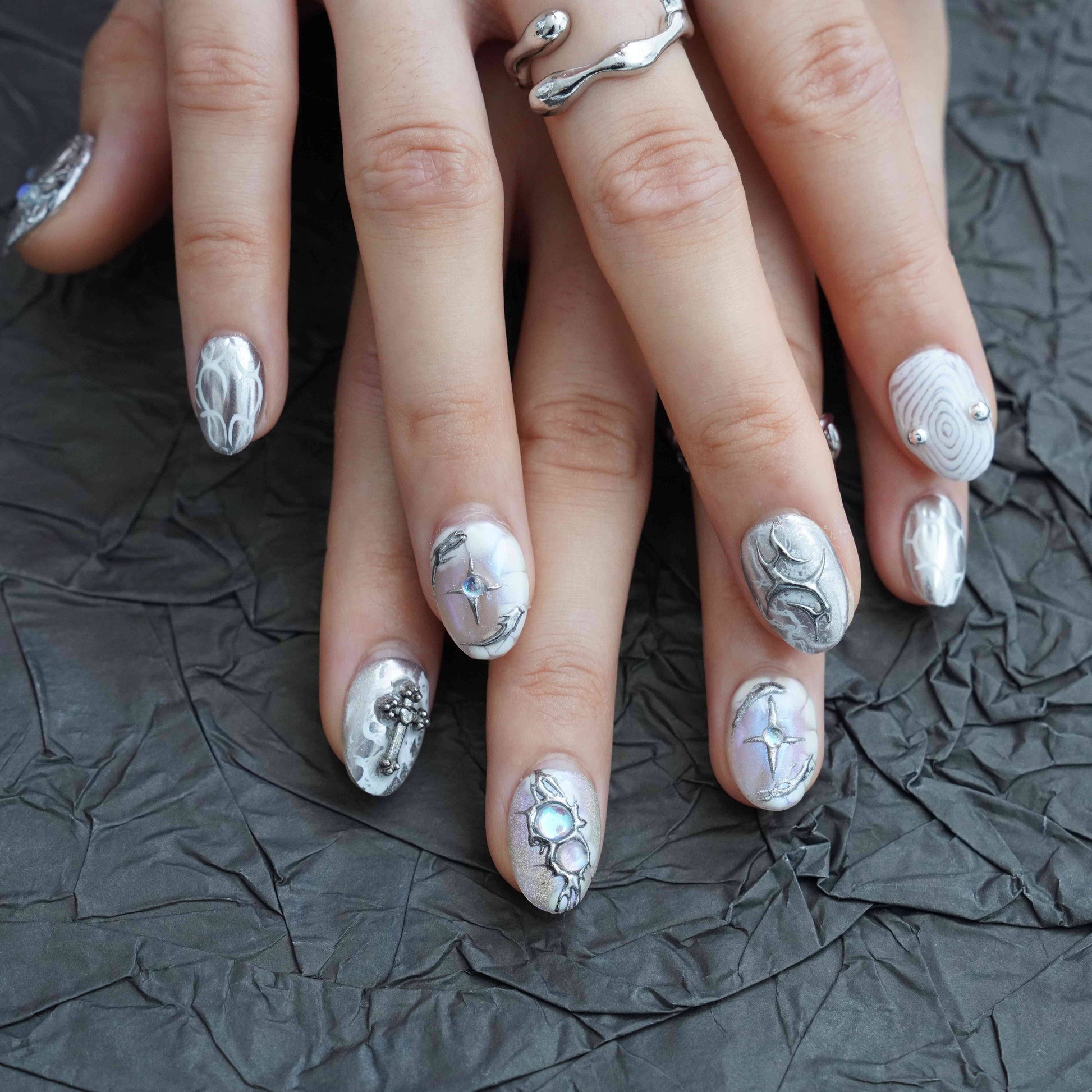 Lunar Relic features Short Round press-on nails with a sleek Chrome finish and vibrant Painted details, blending modern edge with artistic flair. Our diverse, handmade brand celebrates uniqueness through creative design. Each set is 100% handmade, ensuring salon-quality durability and elegance.