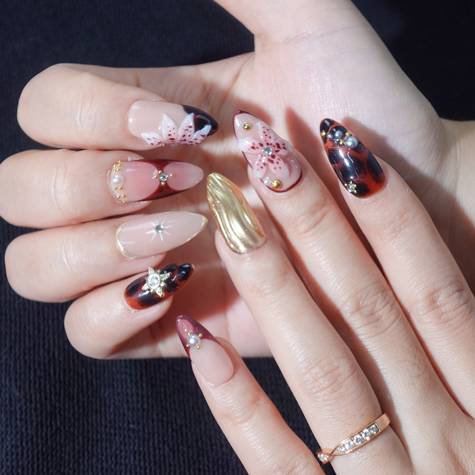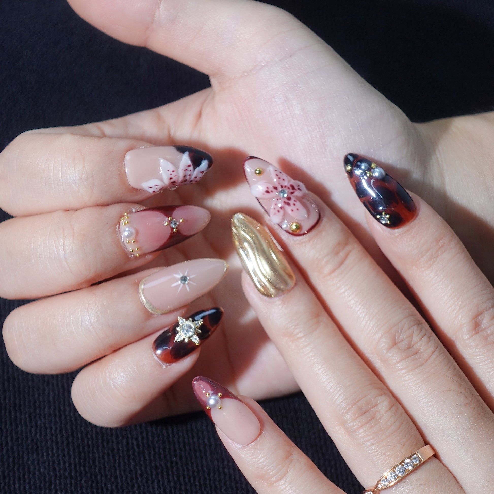 Menard features Medium Almond press-on nails with 3D Autumn flair, blending warm, seasonal tones for an elegant, cozy vibe. Our diverse, handmade brand celebrates creativity in every unique design. Each set is 100% handmade, ensuring salon-quality durability and style.