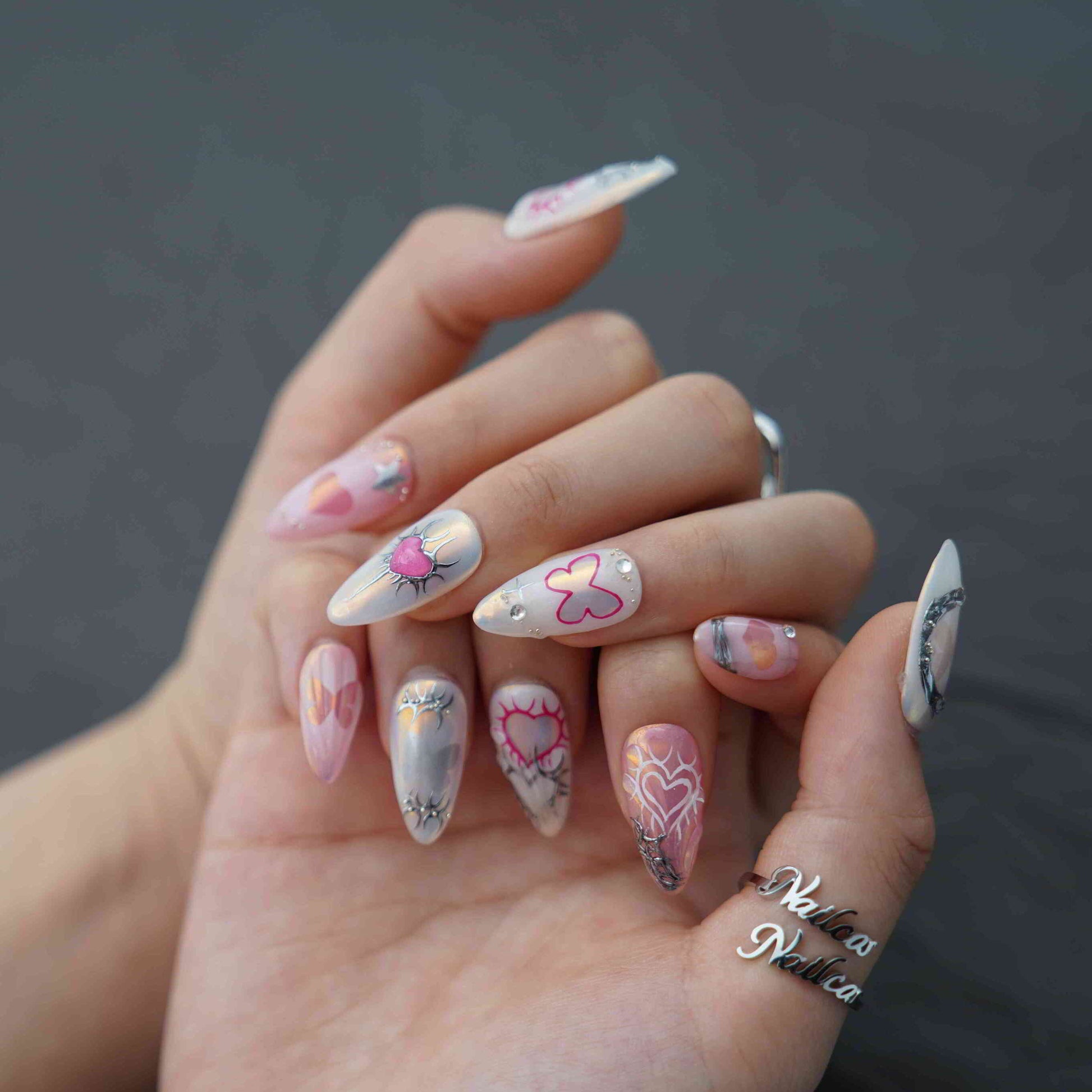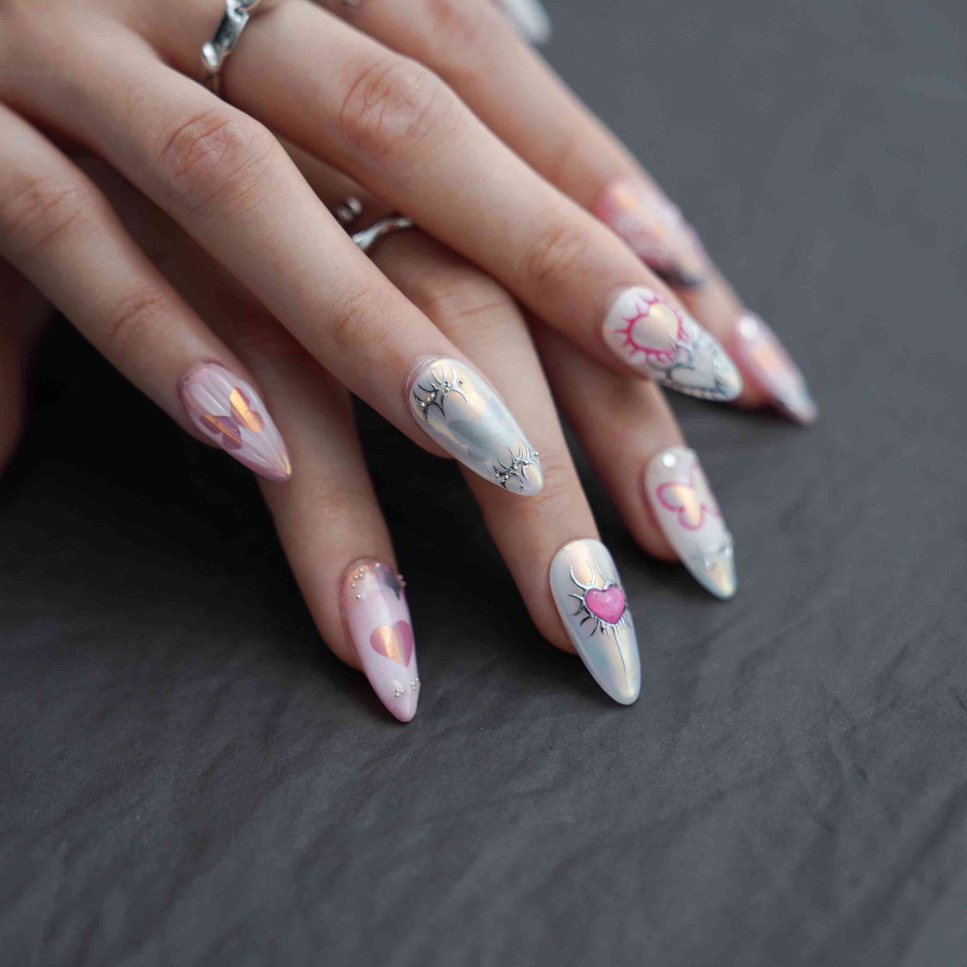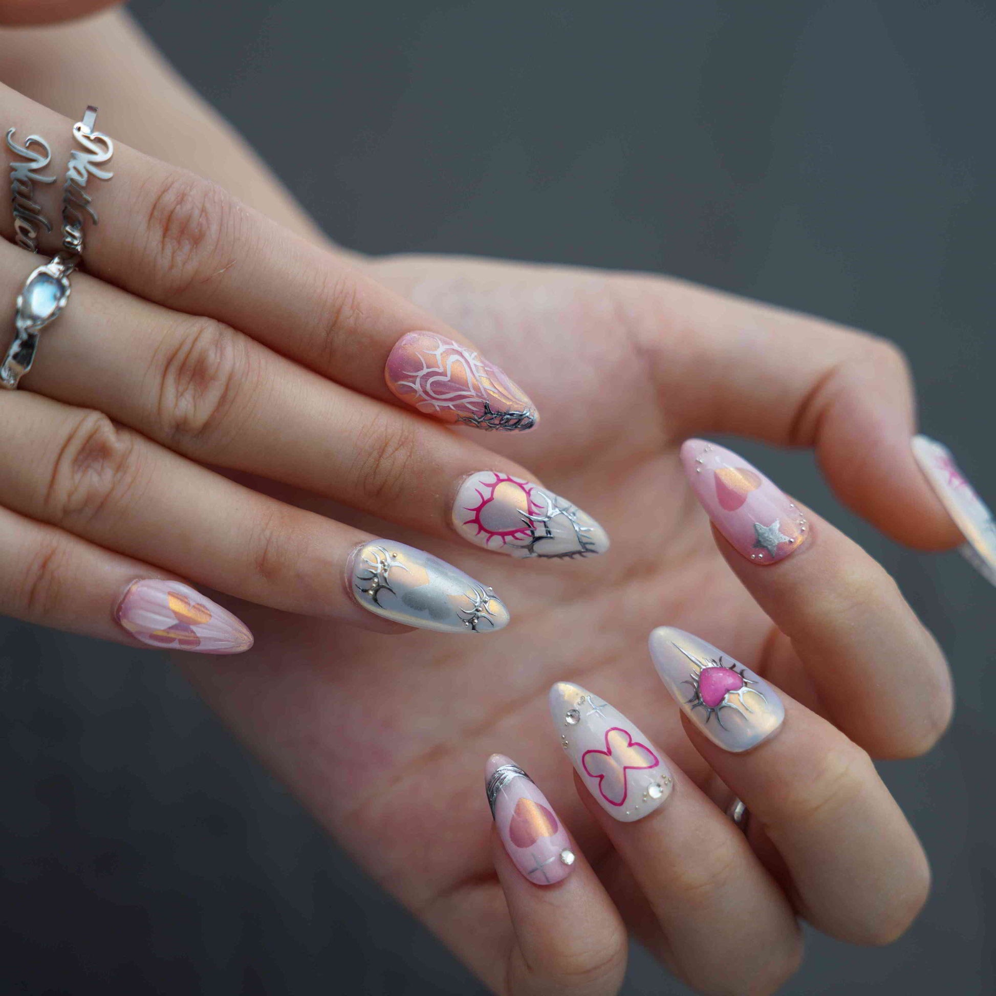 Silver Savage offers a sophisticated look with its Medium Almond shape and Chrome, Painted style. These press-on nails exude an elegant mood. Our diverse, handmade brand infuses creativity into each design. They're 100% handmade for salon-quality wear.
