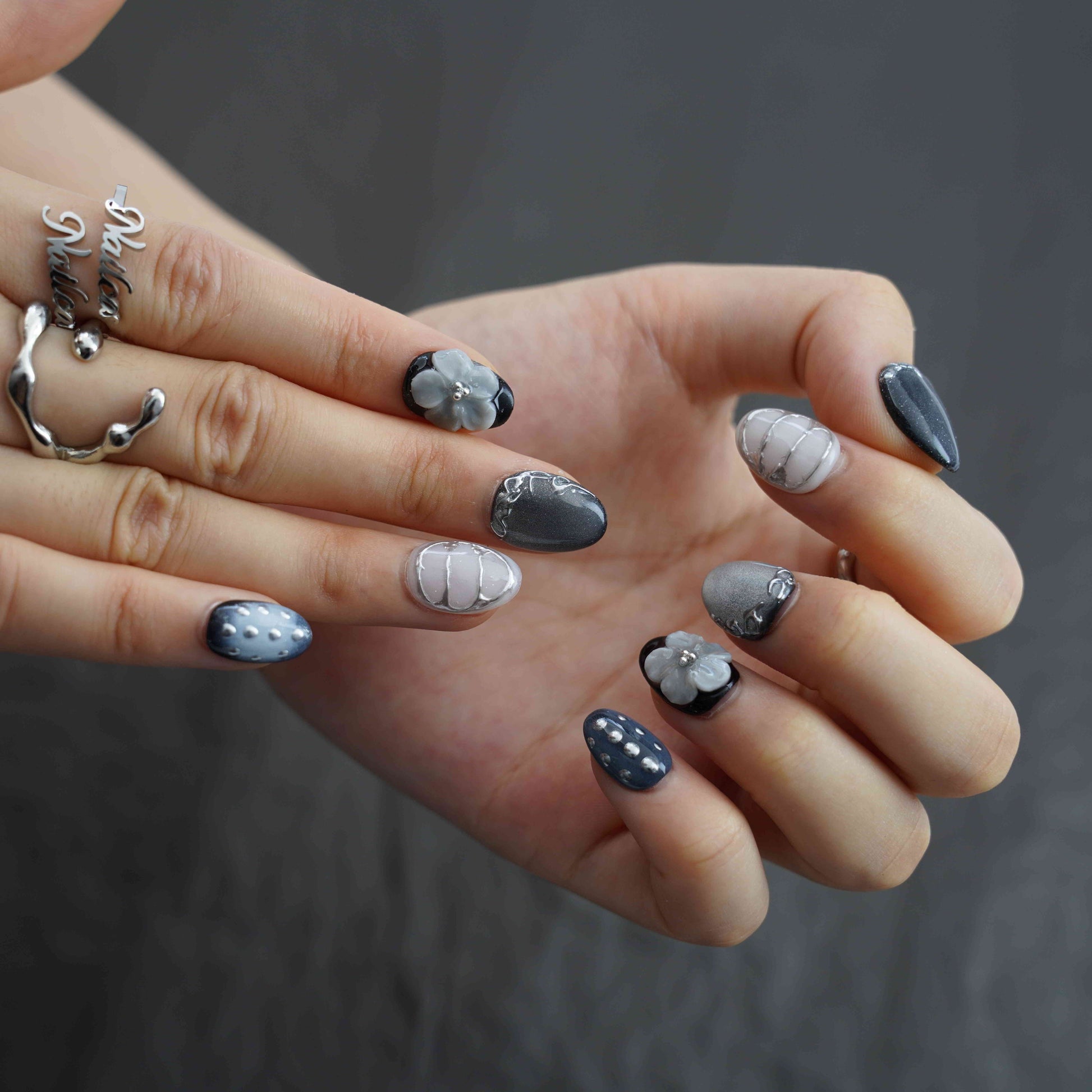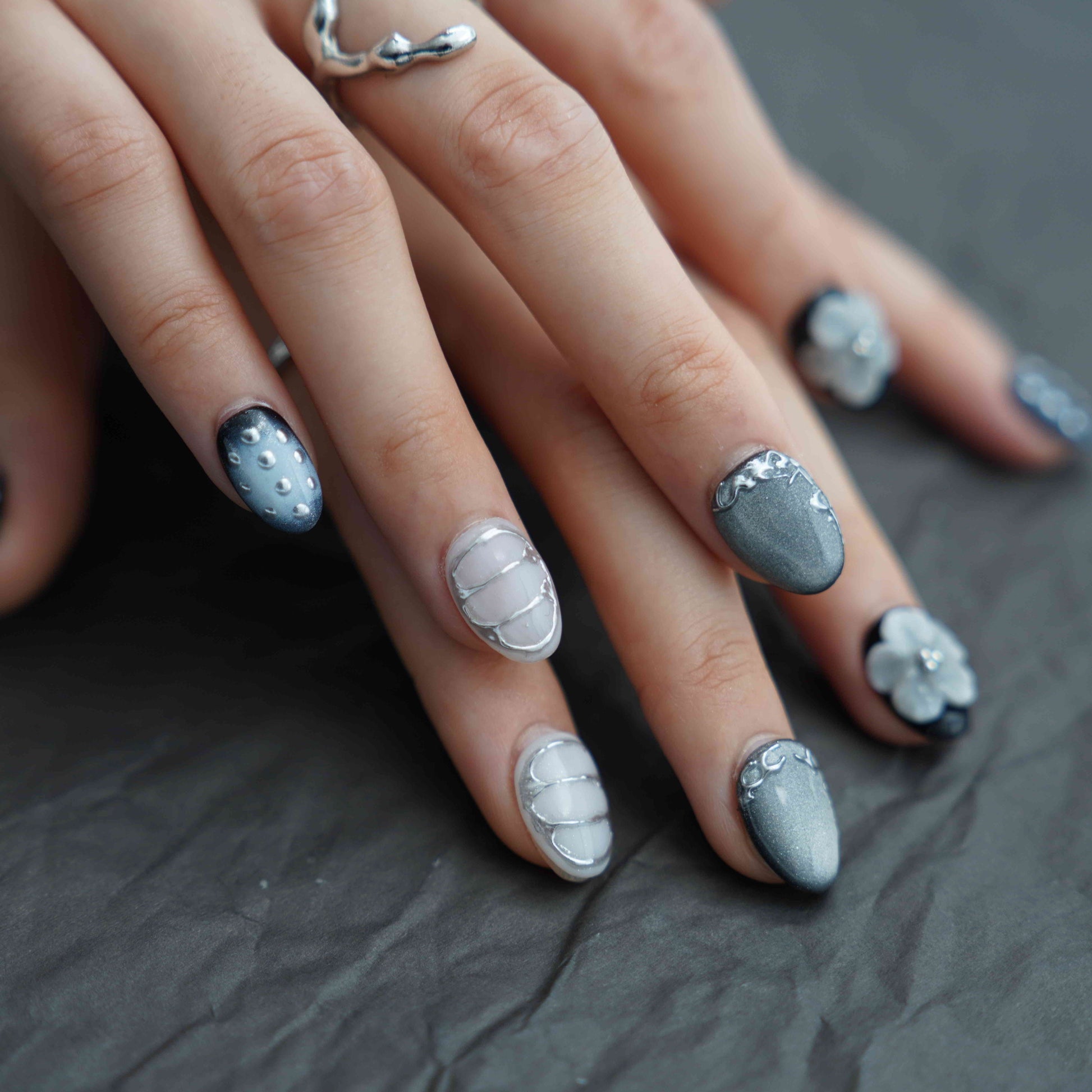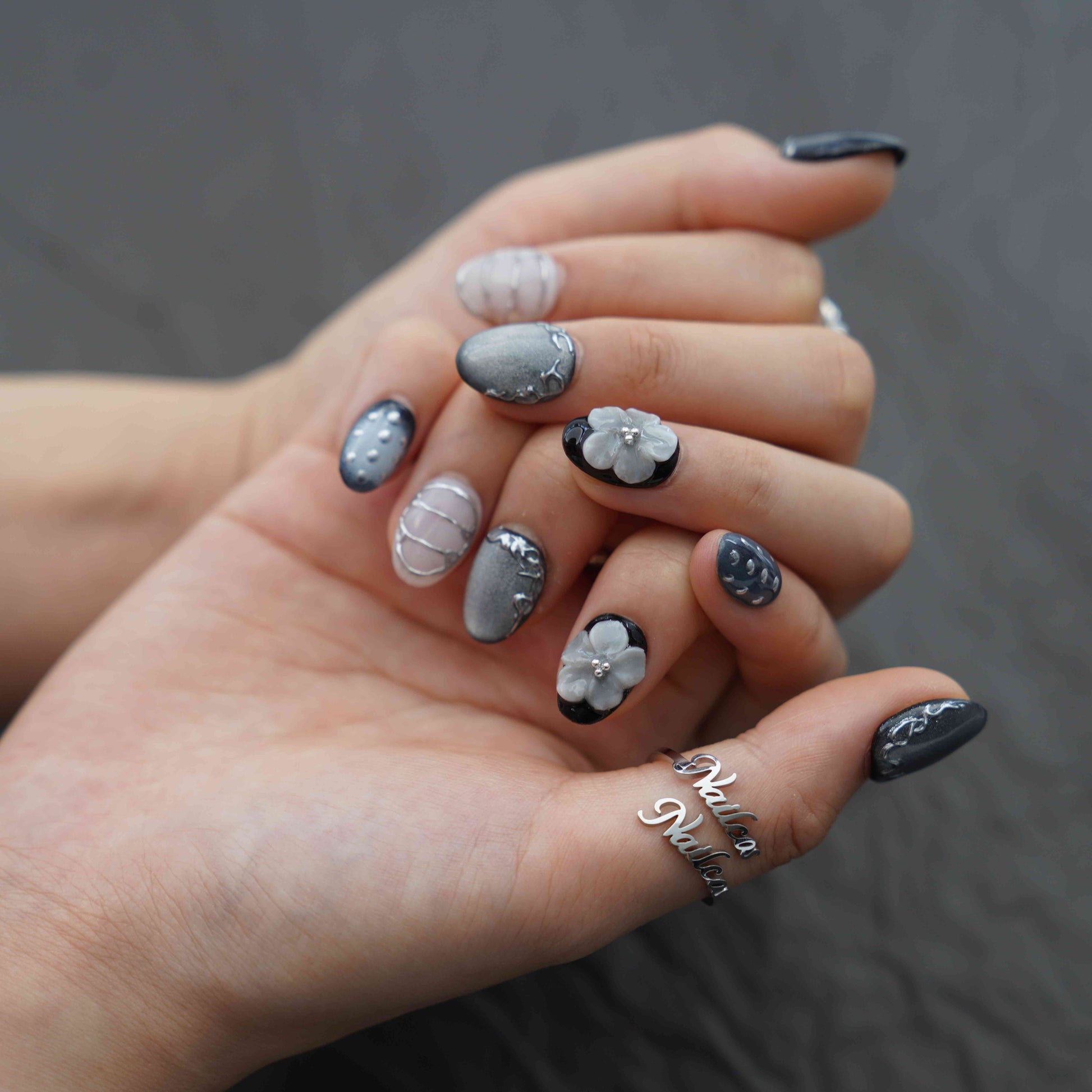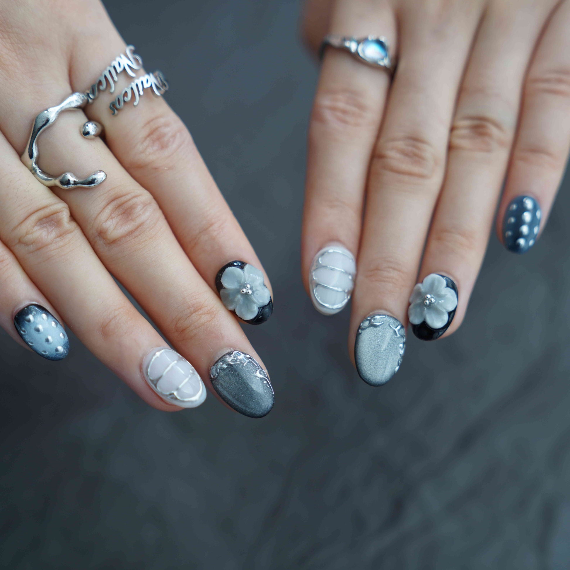 Steel Bloom offers a striking look. These Short Round press-on nails feature a Chrome, 3D Floral style, bringing a modern and elegant vibe. Our diverse, handmade brand infuses creativity into each piece. They're 100% handmade for salon-quality wear.