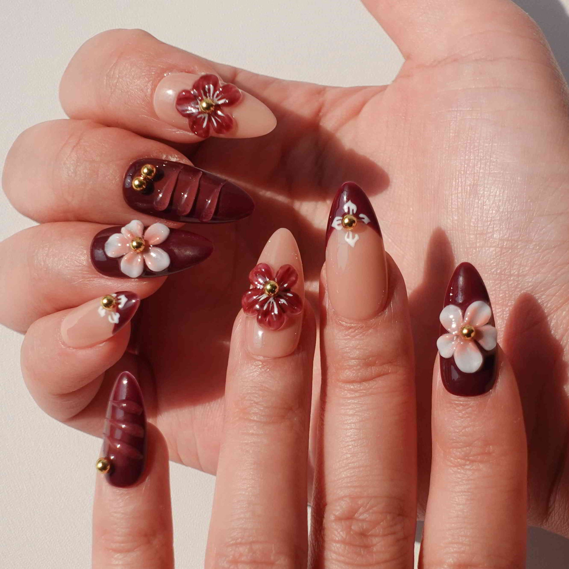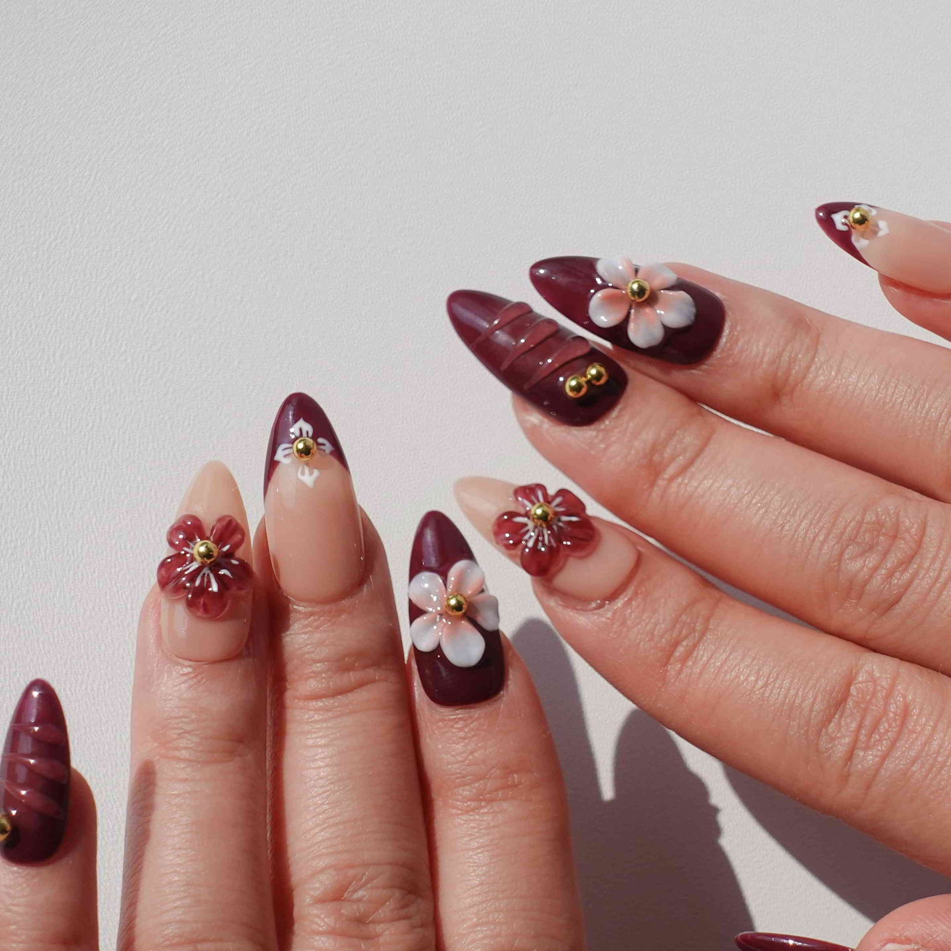 Violet Veil features Medium Almond press-on nails with a charming 3D Floral design, perfect for Autumn and Winter moods. Our diverse, handmade brand crafts unique, creative styles for every personality. Each set is 100% handmade, ensuring elegant, salon-quality wear all season long.